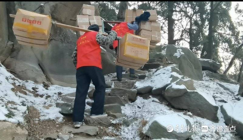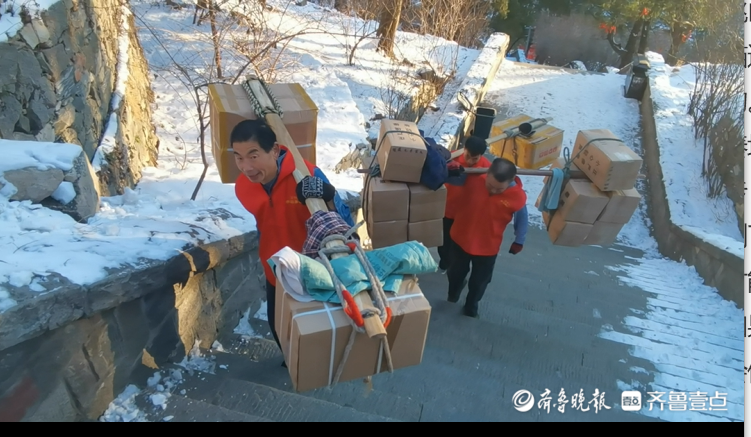 因为前两日下了雪,泰山上风景格外亮眼。然而对于挑山工来说,雨雪天并不是好事儿。山上积雪化得慢,山路变得又陡又滑,给上山增加了难度。从驻扎点要走一段又窄又曲折的小路,才能汇入游客所在的山路。这条小路,他们走过无数遍,即便如此,每一次都还是格外小心。他们目光专注,步伐缓慢,只听得到脚底下踩着雪的窸窸窣窣的声音。