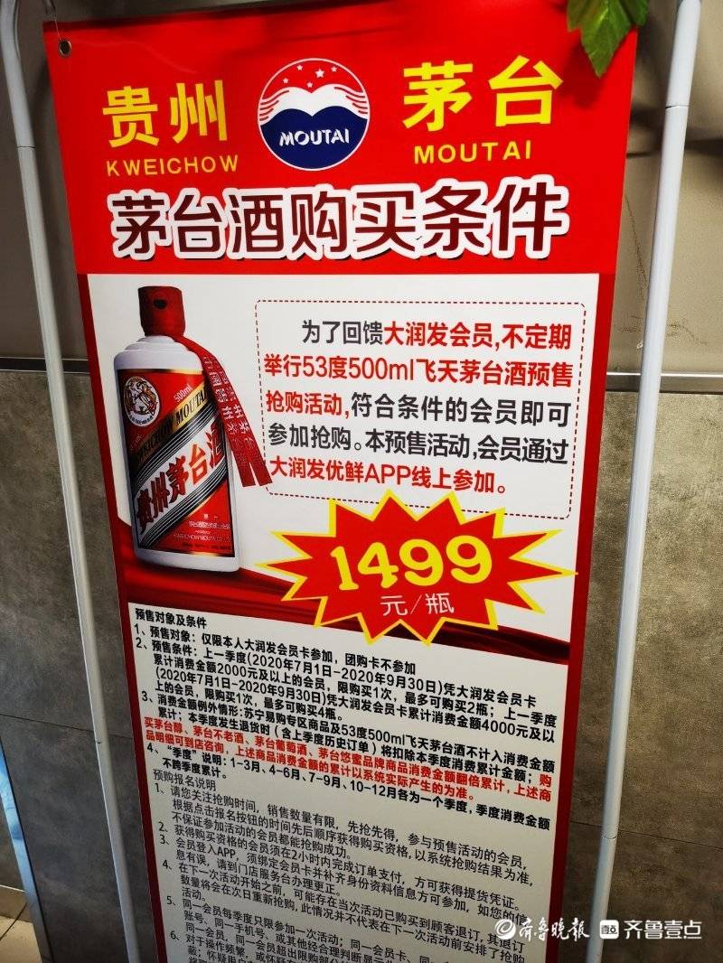 日前,齐鲁晚报·齐鲁壹点记者走进位于济南文化东路的历下大润发,在酒水区,摆在最显眼位置的是茅台酒展柜,标价1499元的飞天茅台也陈列在玻璃柜中,销售员介绍目前飞天茅台没有现货,但可通过线上抢购,条件是上一季度凭大润发会员卡累计消费2000元或4000元以上方可参与,并且限购2瓶或4瓶。