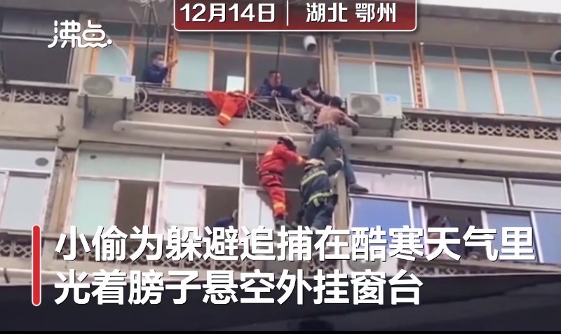 12月14日中午,湖北鄂州。在2°C的寒冷天气里,一小偷为躲避追捕,光着膀子悬空外挂在6楼窗台。民警为防其坠落,用手铐将自己与小偷铐在一起,咬牙坚持拉住他,并求助消防。消防员赶到现场,与民警一起苦劝一小时,小偷忍不住寒冷终于放弃对抗。消防员通过绳降到窗外,合力将其救回。