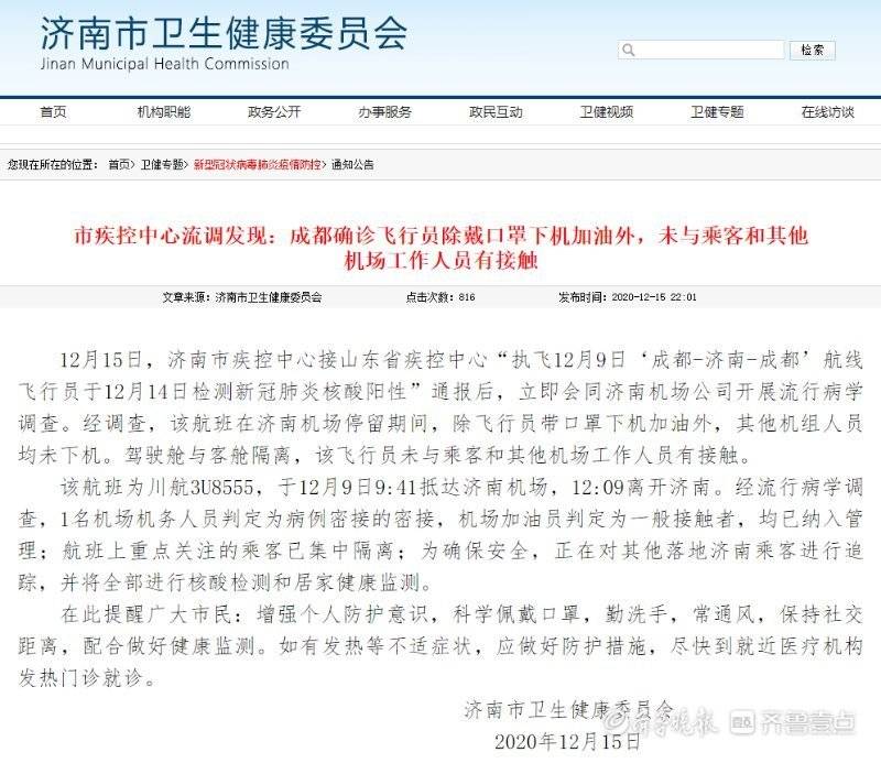 齐鲁晚报·齐鲁壹点记者从市卫生健康委获悉,12月15日,济南市疾控中心接山东省疾控中心“执飞12月9日‘成都-济南-成都’航线飞行员于12月14日检测新冠肺炎核酸阳性”通报后,立即会同济南机场公司开展流行病学调查。经调查,该航班在济南机场停留期间,除飞行员带口罩下机加油外,其他机组人员均未下机。驾驶舱与客舱隔离,该飞行员未与乘客和其他机场工作人员有接触。