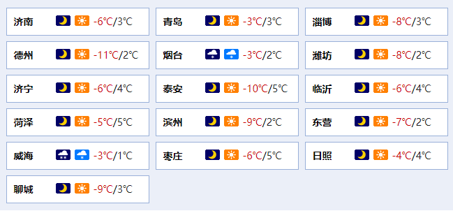 最低气温:鲁西北、鲁中山区和半岛内陆地区-8~-10℃,半岛沿海地区-4℃左右,其他地区-7℃左右。