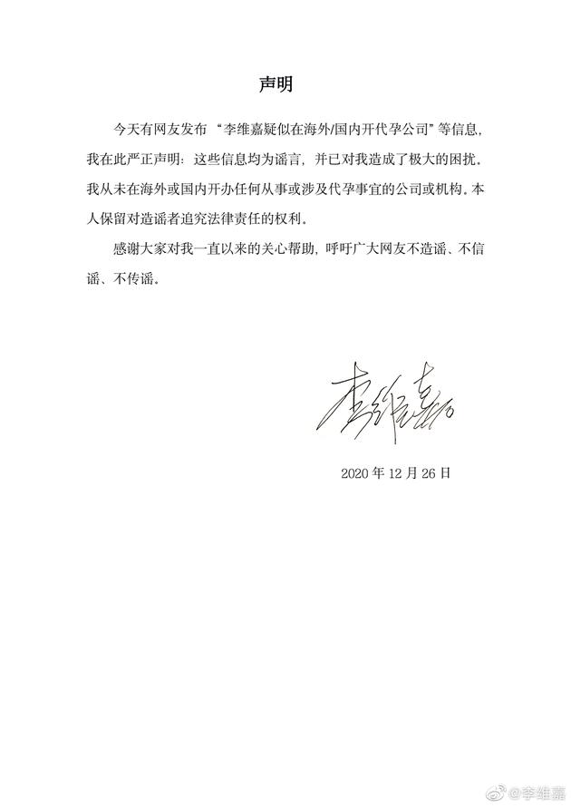 李维嘉发声明否认开代孕公司,呼吁网友不传谣