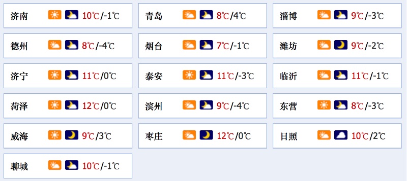 今天白天到夜间,半岛东部地区天气多云间阴,其他地区天气多云间晴;鲁西北、鲁西南和鲁中的东部地区今天上午有雾。夜间最低气温:鲁西北、鲁中山区和半岛内陆地区-2℃左右,半岛沿海地区1℃左右,其他地区-1℃左右。