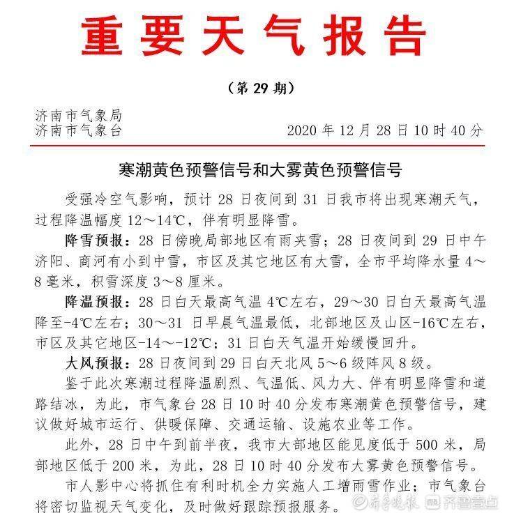 “大约在28日晚8点左右,济南部门地区有雨夹雪,到了晚上11点左右会转成雪一直持续至29日白天。”据济南市气象台预报员预计,28日夜间到29日中午济阳、商河有小到中雪,市区及其它地区有大雪。28日白天最高气温4℃左右,29~30日白天最高气温降至4℃左右;30~31日早晨气温最低,北部地区及山区-16℃左右,市区及其它地区-14~-12℃;31日白天气温开始缓慢回升。28日夜间到29日白天北风5~6级阵风8级。为此,济南市气象台于2020年12月28日10时40分发布寒潮黄色预警信号。