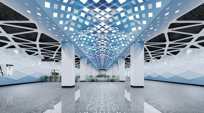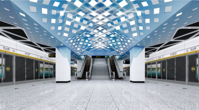 历山路站位于北园大街与历山路交叉口,横穿历山路,作品以清•余正酉所作《明湖曲》为灵感来源,设计方案以“明湖诗韵,波光意镜”为设计主题,采用空间一体化的设计手法,以太阳照射下水面波光为设计元素,静谧淡雅的蓝色调,在灯光的映衬下如梦如幻,表现东风吹皱波光粼粼的空间意象。