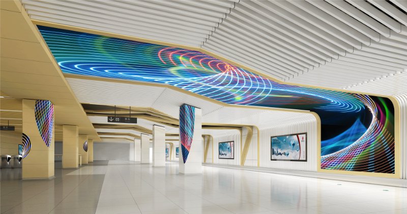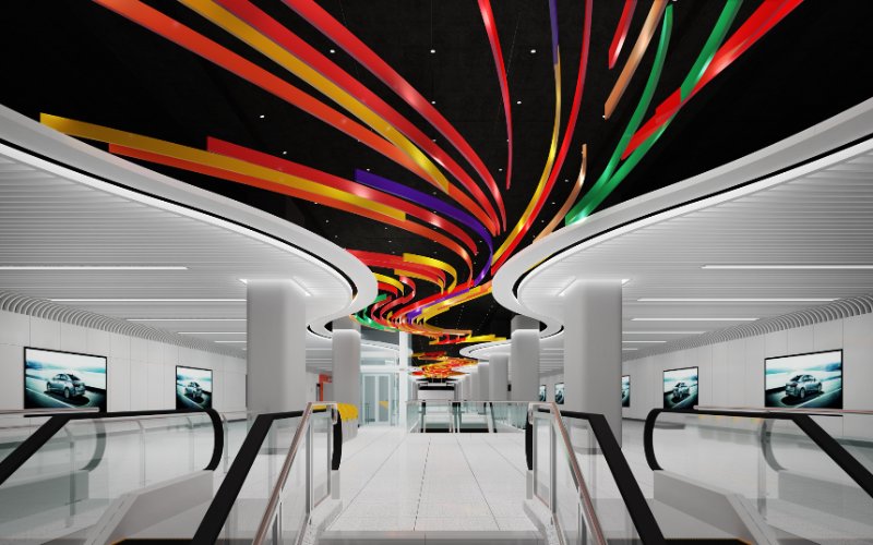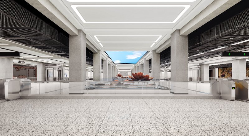 本站公共艺术品以“像素济南”为主题,将济南的经典风景齐烟九点和鹊华秋色的经典山水画作为灵感的出发点,融入泉水和黄河元素,利用人工智能算法实时生成图像,并通过从墙面到天花贯通的LED展示带,以新颖的方式赋予这些内容科技感、未来感,比如利用其特点巧妙展现泉水流淌形成瀑布的效果,还有黄河川流不息的意象,以此体现出济南的城市特色,充分展现泉城未来的艺术与科技融合发展的无限可能。