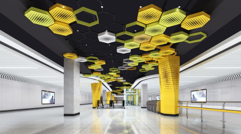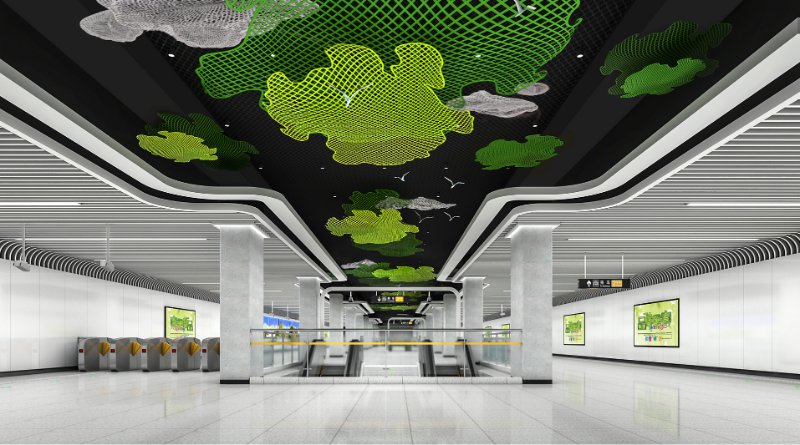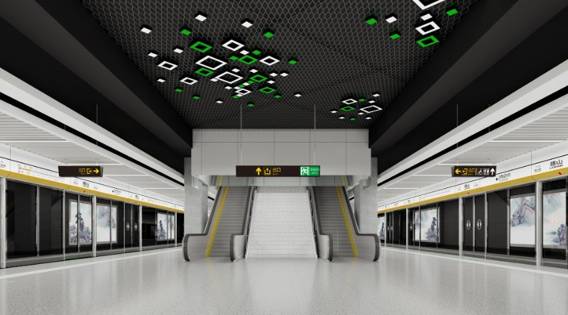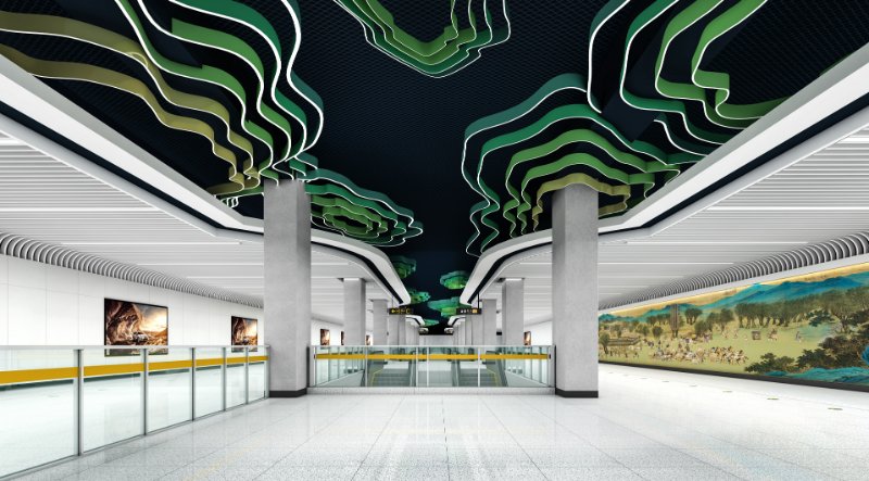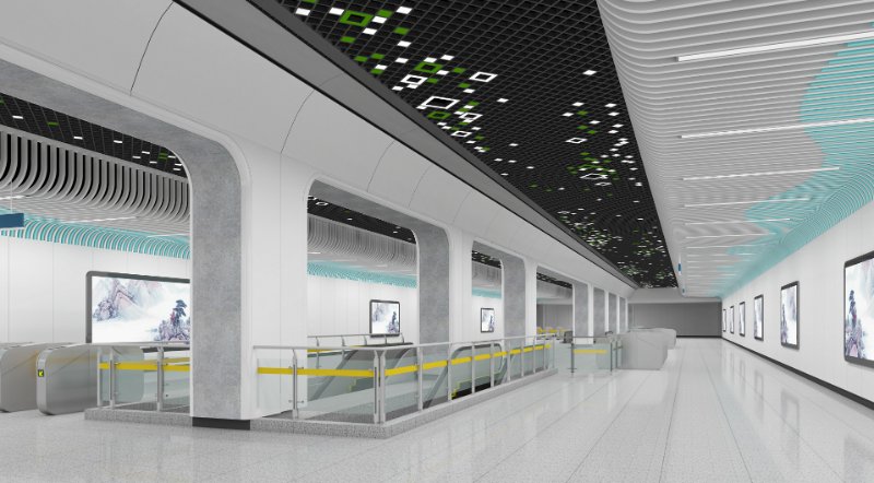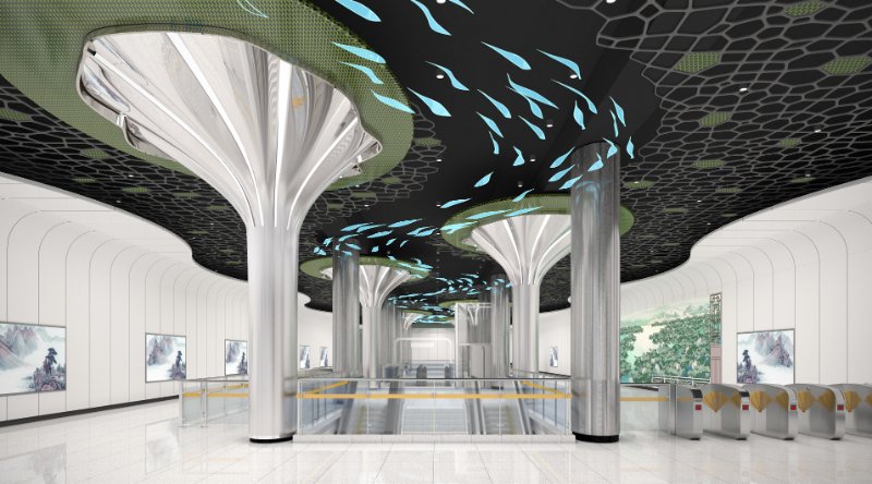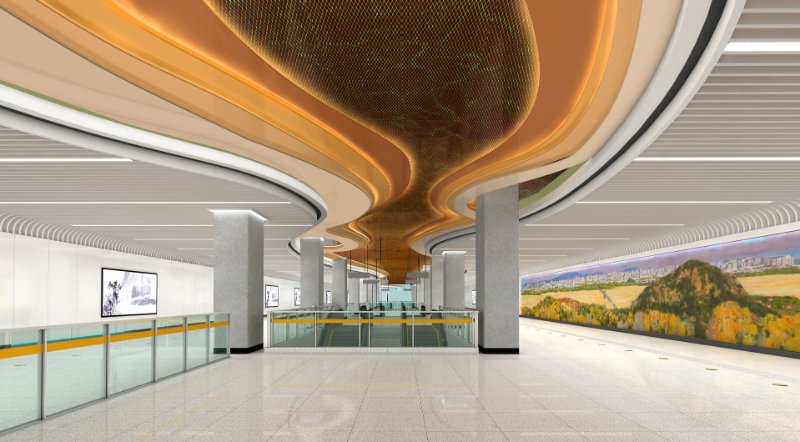 本站公共艺术品以“绿水青山”为主题,将腊山自然风光融入到山水画之中,为赋予画面现代感和增加作品互动性,使用参数化技术把图像转化为实体的金属球阵列,金属球的镜面效果在乘客来往走动时产生丰富的变化,让画面静中有动,增加了作品的趣味性,另外在作品展现形式上,画面内容打破边界束缚,融入站厅空间,并与站厅天花相互照应,形成和谐共融的空间艺术氛围。