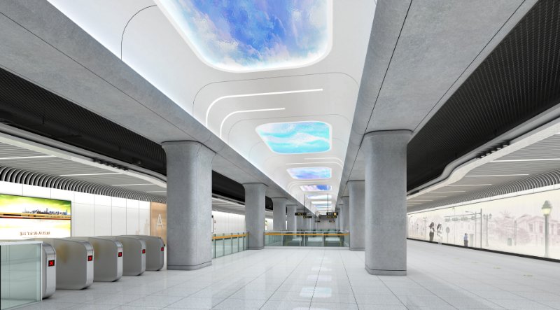 济南站北站位于济南火车站北侧,通普街与堤口路交叉口。具有强烈的交通属性。济南站北站重点打造交通文化,站厅顶部装置艺术品模拟列车车厢形态,天窗外朵朵白云,通过变幻的LED灯光,呈现出绚丽多变的天空色彩,打破地下空间的沉闷和压抑感,增加地铁空间的新鲜感受和趣味性,进一步增强了乘客对车站地域方位的辨识度。使乘客在行进的过程中,重温百年交通,辉煌历史,感受到时光与故事,也共享济南交通飞速发展结出的累累硕果。