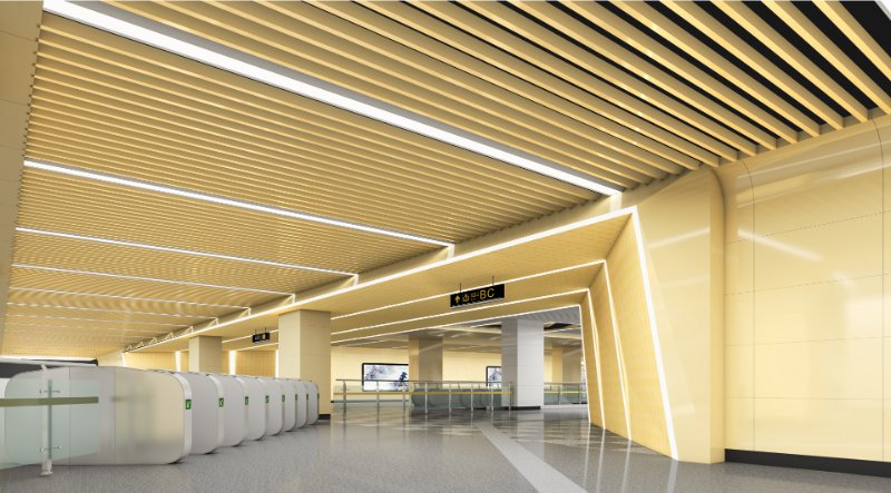 八涧堡站位于奥体西路与八涧堡北路交叉口,紧邻大辛庄商代文化遗址,该遗址是中国第二个出土甲骨文的商代遗址。该站与济南轨道交通3号线一期工程进行换乘,车站装修延续通过非对称的设计语言,利用对比呼应的设计手法,将历史与当下时代融合在地下空间。提取济南市树柳树的柳叶元素,将天花、地面、墙面通过线条的的律紧密联系在一起,形成空间一体化设汁。线条部位搭配甲骨文印记,使整个空间呈现出现代与历史相融的氛围,突出表达现代济南的商业气氛及悠久历史文亿的熟力。