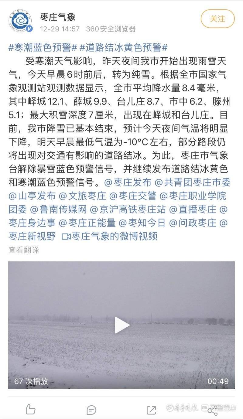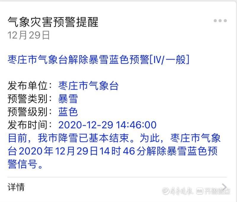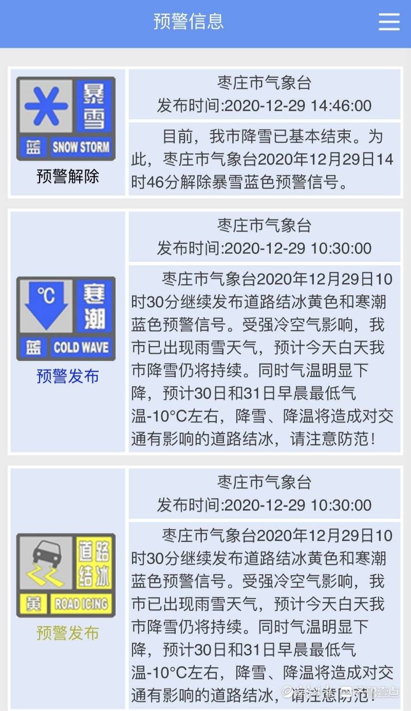 12月29日14时46分,枣庄市气象台在其官方微博账号及微信公众服务号上发布解除暴雪蓝色预警信号。 受寒潮天气影响,昨天夜间我市开始出现雨雪天气,今天早晨6时前后,转为纯雪。根据全市国家气象观测站观测数据显示,全市平均降水量8.4毫米,其中峄城12.1、薛城9.9、台儿庄8.7、市中6.2、滕州5.1;最大积雪深度7厘米,出现在峄城和台儿庄。 目前,枣庄降雪已基本结束,预计今天夜间气温将明显下降,明天早晨最低气温为-10℃左右,部分路段仍将出现对交通有影响的道路结冰。 为此,枣庄市气象台解除暴雪蓝色预警信号,并继续发布道路结冰黄色和寒潮蓝色预警信号。
