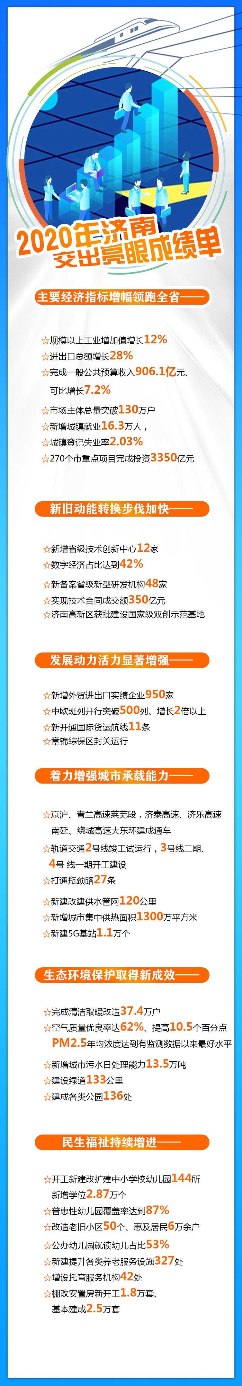 一图读懂|2020年济南交出亮眼成绩单 济南发布厅 2021-01-12 8113 2020年是极不平凡的一年。济南主动融入、服从服务黄河流域生态保护和高质量发展重大国家战略,统筹推进疫情防控和经济社会发展,加快打造“五个济南”,建设“大强美富通”现代化国际大都市,交出了亮眼成绩单。 责任编辑:孟燕