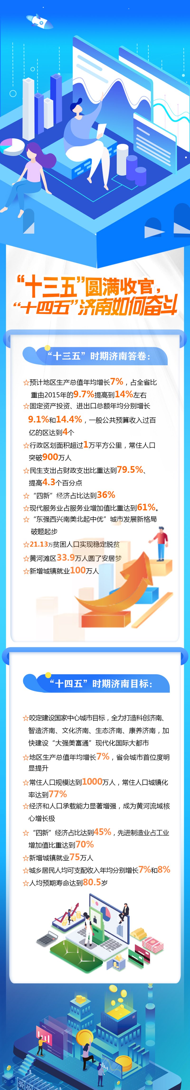 一图读懂|“十三五”圆满收官,“十四五”济南如何奋斗 济南发布厅 2021-01-12 2716 “十四五”时期是济南在新的起点上深入落实黄河重大国家战略,加快建设“大强美富通”现代化国际大都市极为关键的五年。“十四五”时期济南如何奋斗? 责任编辑:孟燕