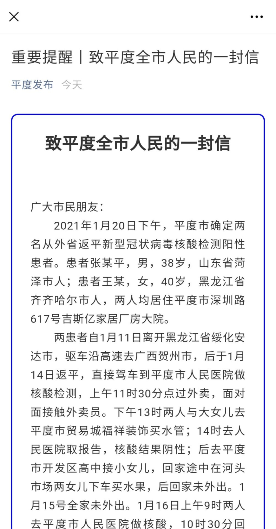 1月21日凌晨,平度发布微信公众号发布致平度全市人民的一封信,确定两名从外省返平新型冠状病毒核酸检测阳性患者,并且公布活动轨迹。