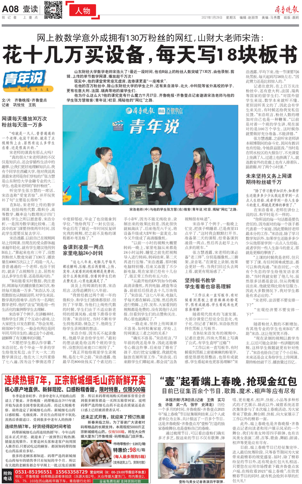 他的课究竟有什么魔力,他为什么这么火?1月27日,齐鲁晚报·齐鲁壹点记者邀请宋浩老师与学生张方慧做客“青年说”节目,揭秘这位数学老师的“网红”之路。
