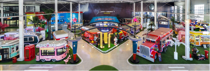 走进街景科技产品展厅,就像到了迪斯尼乐园:各式各样色彩鲜艳的移动空间:三层楼高的火车瞭望塔、会变形的双层巴士,糖果色餐车、操作台不到1平方米的“创业神器”,经营用电动三轮车“店小驴”……
