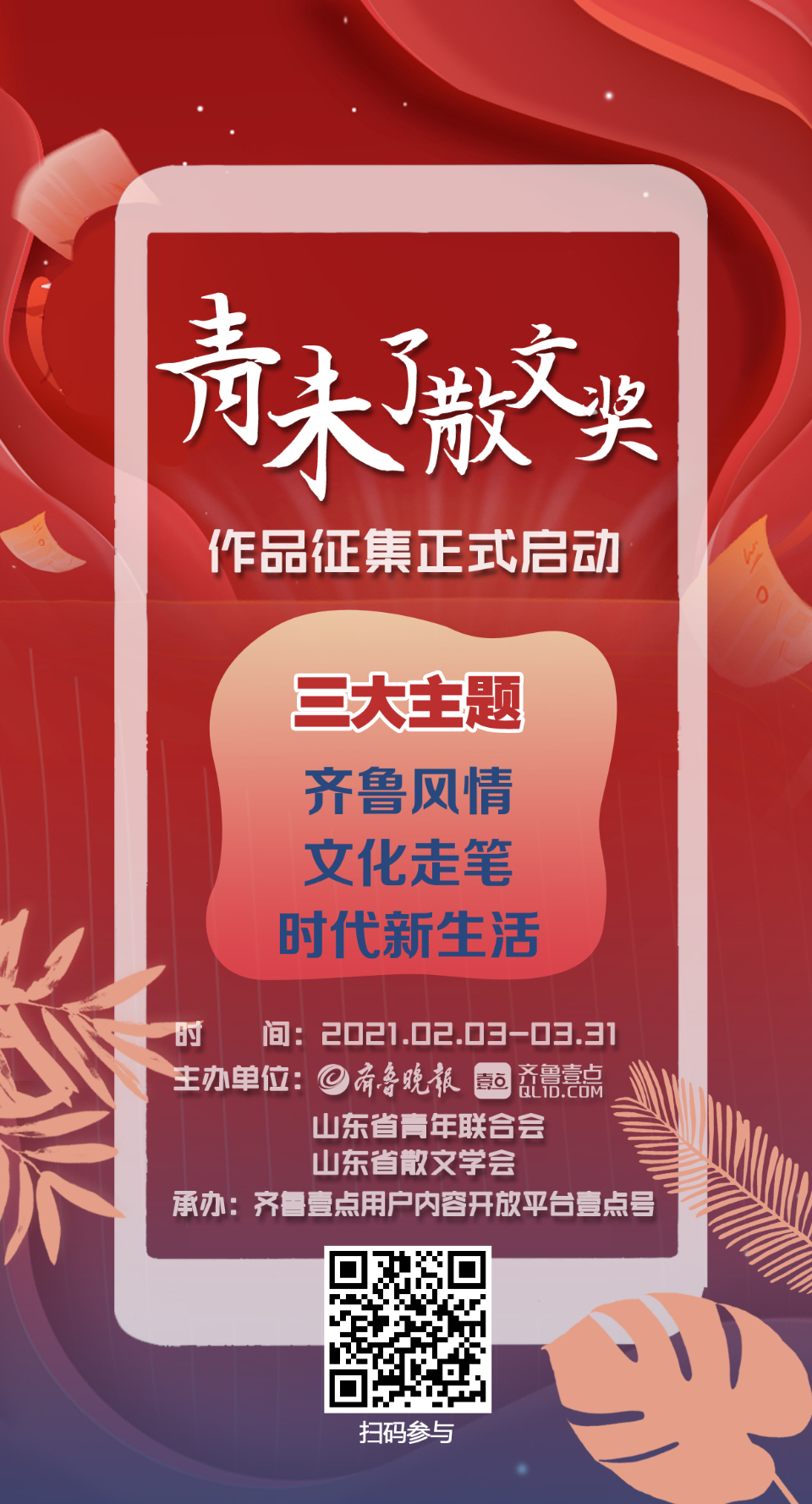 参与作品将得到齐鲁壹点重点推荐和全网分发,择优在齐鲁晚报青未了副刊刊登。优秀创作者将得到重点包装和推荐。