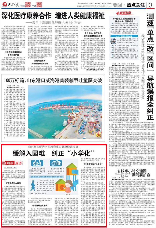 今年山东省政府工作报告的“2021年重点工作”部分,提出启动实施第四期学前教育行动计划,新建改扩建幼儿园200所以上。而在此前的2018年到2020年第三期学前教育行动计划中,山东新建改扩建幼儿园9830所,新增幼儿园学位139.8万个,在园幼儿比2017年增加131万人。