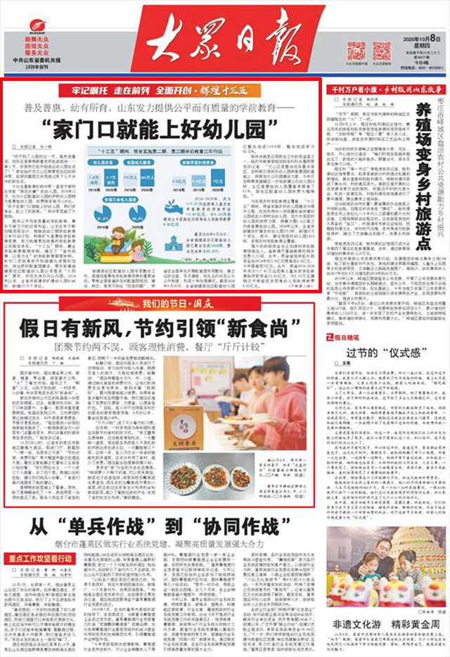 学前教育必须坚持公益普惠基本方向,公办幼儿园和普惠性民办幼儿园在园儿童比例不低于该行政区域在园儿童总数的80%,其中公办幼儿园在园儿童比例不低于该行政区域在园儿童总数的50%……《山东省学前教育条例》2020年1月1日起正式实施,幼儿园多项指标有了新标准。
