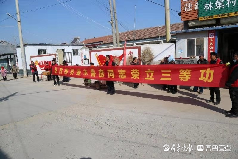 2月8日上午10时许,阳光温暖,年味渐浓。在菏泽市郓城县郭屯镇林集的村委大院前,锣鼓喧天,几个党员拉开了一条上写“热烈祝贺端木鲁彦同志荣立三等功”长长的红布黄字横幅,街上的人们称赞地说:“看人家,当兵立功了多光荣!”