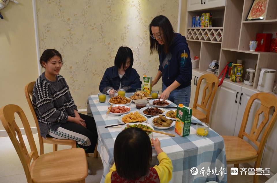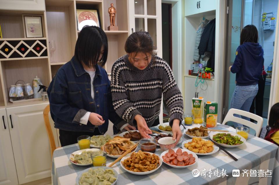 2月11日下午,因疫情缘故无法回家过年的山东师范大学河北籍学生张琳璐和王小哲,被辅导员史飞接到家中一起吃年夜饭。一桌丰盛的菜肴,一家五口的盛情招待,让两个女孩感动不已。