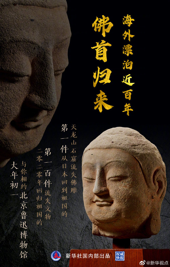 记者从国家文物局获悉,经过曲折艰苦的追索,流失海外近一个世纪的天龙山石窟第8窟北壁主尊佛首已于2020年12月12日回归祖国怀抱。这是近百年来第一件从日本回到祖国的天龙山石窟流失佛雕,也是2020年回归祖国的第100件流失文物。想一睹佛首真容吗?大年初一至3月14日,它将亮相北京鲁迅博物馆“咸同斯福——天龙山石窟国宝回归暨数字复原特展”。之后,按照流失文物回归原属地的国际共识,在具备安全条件前提下,佛首将会回到天龙山石窟,在太原市天龙山石窟博物馆收藏展示。