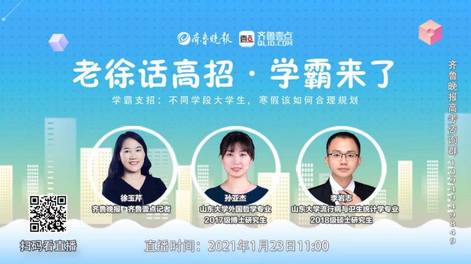 最近一段时间,高校陆续放了寒假。因疫情防控缘故,这个寒假比往年更长一些。那么,超长寒假怎样才能过得更有意义?1月23日11:00,“老徐话高招”邀请山东大学两名校长奖获得者——山东大学外国哲学专业2017级博士研究生孙亚杰、山大流行病与卫生统计学专业2018级硕士研究生李岩志做客直播间,为大家支招。
