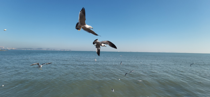 海鸥在浅海处觅食、玩耍,完全不惧怕人类,甚至敢停在海岸边离游客极近的柱子上。游客与海鸥间的互动,象征着人与自然之间和谐相处,更是给立春的海边增添了和谐、有爱的景象。