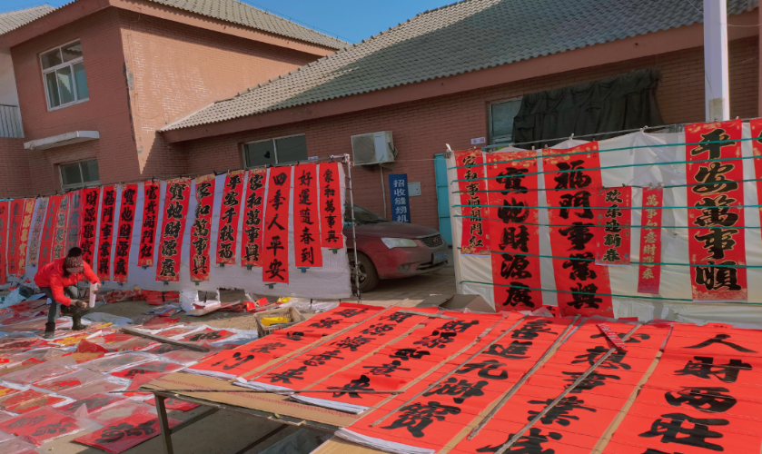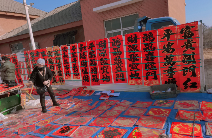 过新年最不可缺的就是春联。春节贴春联的民俗起于宋代并在明代开始盛行。如今,春联已是传承下来的新年习俗之一。乡村集市每逢过年都会赶年集,春联则成为年集上一道亮丽的风景线。