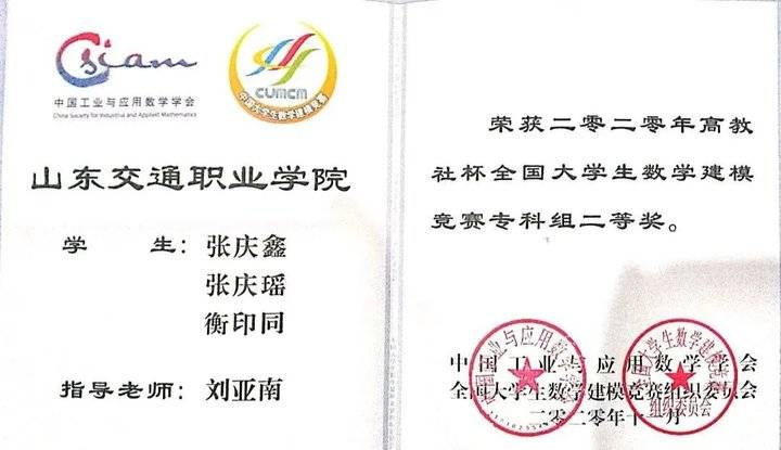鼓励学生积极参加大学生数学竞赛、创新创业和专业类竞赛,先后荣获全国大学生数学建模竞赛专科组国家二等奖、山东省大学生数学竞赛专科组一等奖、2019年全国移动互联创新大赛山东赛区高校组一等奖和山东省职业院校技能竞赛二等奖。