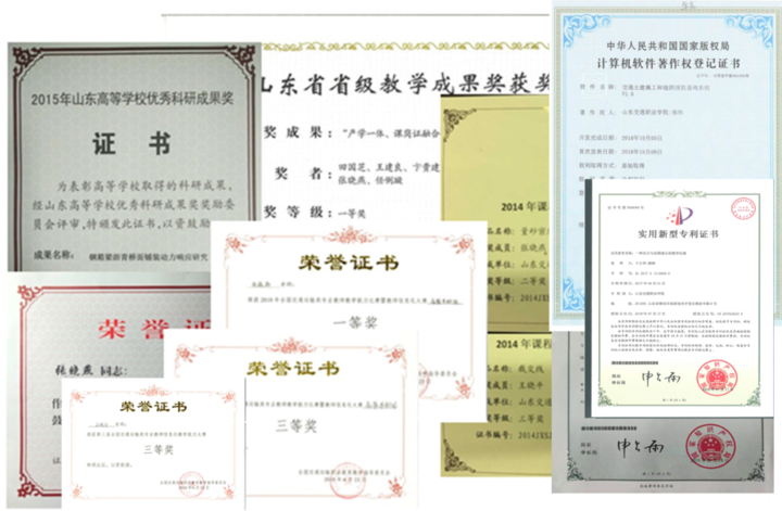 山东交通职业学院公路与建筑系先后荣获山东省省级教学成果一等奖1项、二等奖2项;立项山东省科学技术厅自然科学基金项目1项、西藏自治区科学技术厅项目2项,承担市厅级及以上教科研项目20余项,发表论文百余篇,授权发明专利、实用新型专利30项,荣获山东省高等院校优秀科研成果(自然科学类) 二等奖1 项、三等奖2项。