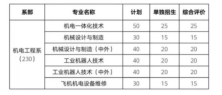 机电工程系开设机电一体化技术、机械设计与制造、汽车制造与装配技术、工业机器人技术、飞机机电设备维修等专业。拥有教育部现代学徒制试点专业1个、工业机器人操作与运维1+X证书试点专业1个、工业机器人领域职业教育合作项目1个、国家骨干专业2个,省级特色专业2个、现代学徒制试点专业2个,国际合作办学专业2个。