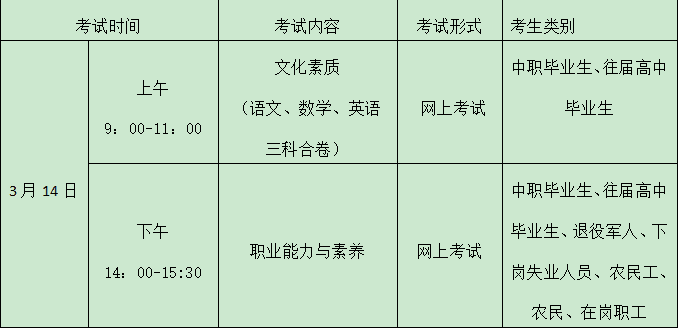 考试包括文化素质和职业能力与素养两部分;退役军人、下岗失业人员、农民工、农民、在岗职工等免予文化素质考试。