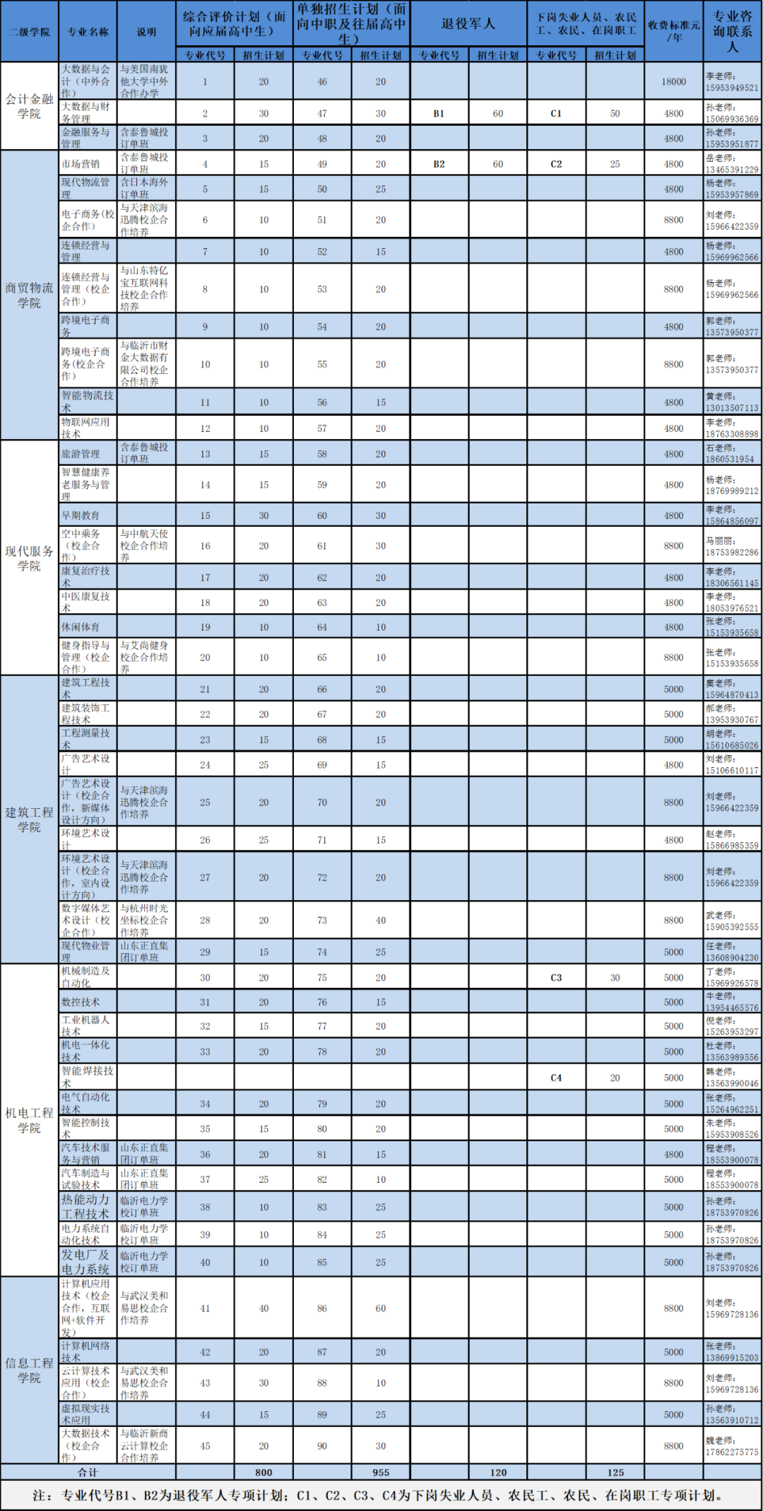 临沂职业学院2021年单独招生和综合评价招生计划表