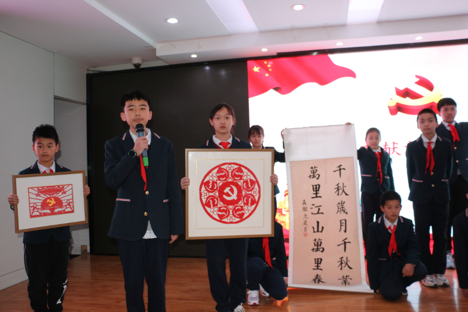 随后,队员们还展示了亲手制作、绘制的剪纸、书法、绘画作品,以此表达庆祝建党100周年的欢快之情、对党的关怀与温暖的赞颂之情……当学生用小小的剪刀一点一点描绘出花团锦簇中的党徽,心中充满了骄傲和自豪——没有共产党就没有新中国!我爱国,更爱党!《千秋岁月千秋业,万里江山万里春》《伟大征程,光辉千秋》两幅书法作品,表达了愿党的伟大事业千秋万代,祖国的明天更加富强的祝福。国画《红梅赞》赞颂中国共产党坚毅不拔的品格、生生不息的革命精神;儿童画《红领巾心向党》表达了少先队员对党的敬仰,永远跟党走的坚定信念。