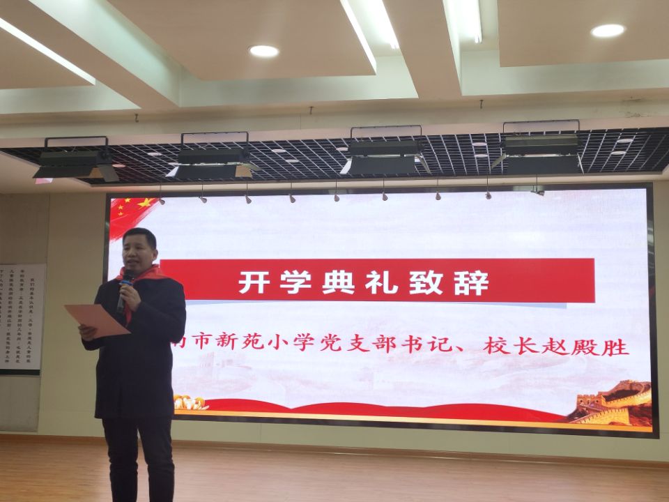 学校党支部书记、校长赵殿胜为新学期开学典礼致辞,他希望全体师生发扬“为民服务孺子牛、创新发展拓荒牛、艰苦奋斗老黄牛”三牛精神,在推进新苑小学大发展,建设天桥教育强区征程上做出积极的更大贡献。