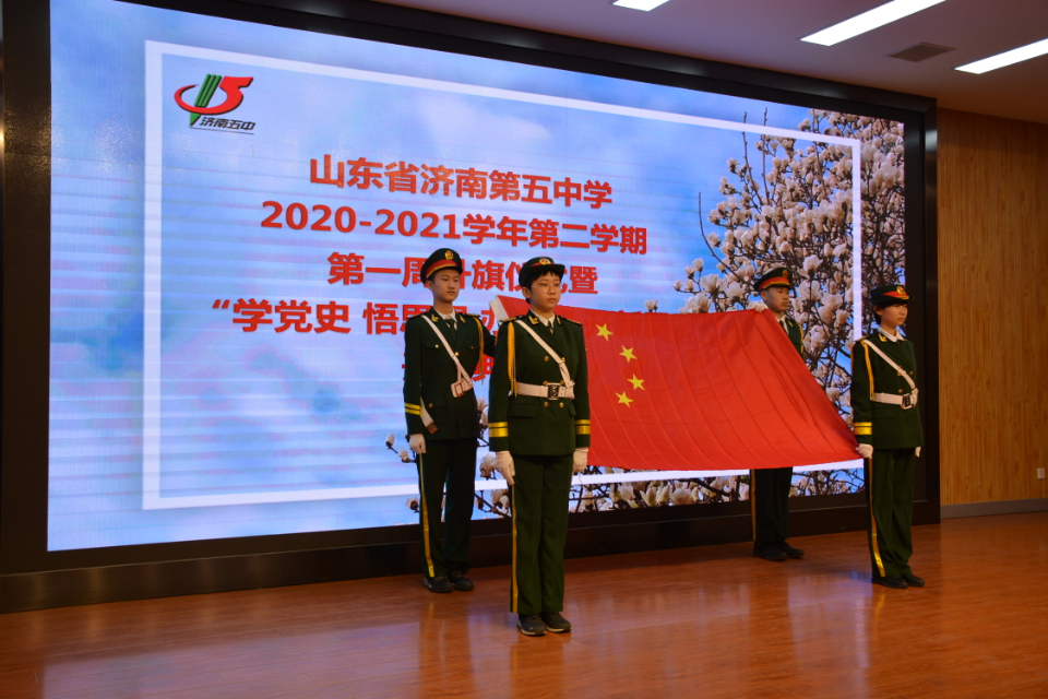 上午9点30分,在雄壮的国歌声中,全体师生静穆肃立,济南五中举行了新学期开学典礼暨第一周升旗仪式。典礼以“学党史 悟思想 办实事 开新局”为主题,采用现场和收看直播相结合的方式。