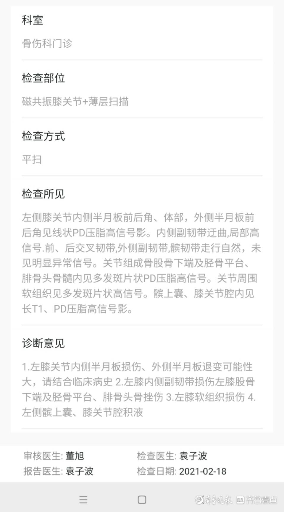 “在休息室,工作人员给我进行了简单处理,但是我感觉还是非常疼,后来就去了医院。”王先生到平度当地医院检查后发现,其左膝关节内侧半月板损伤,左膝内侧副韧带损伤以及还有多处骨骼挫伤。经过几天的住院手术治疗,王先生出院回家疗养。记者了解到,因伤情还未完全恢复,王先生仍在平度老家休养,目前还未返回工作地。