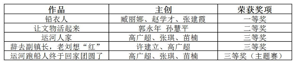 由山东分站赛选拔推荐的《铅衣人》、《让文物活起来》、《运河人家》、《辞去副镇长,老刘想“红”》、《运河跑船人终于回家团圆了》等五件作品荣获大奖。