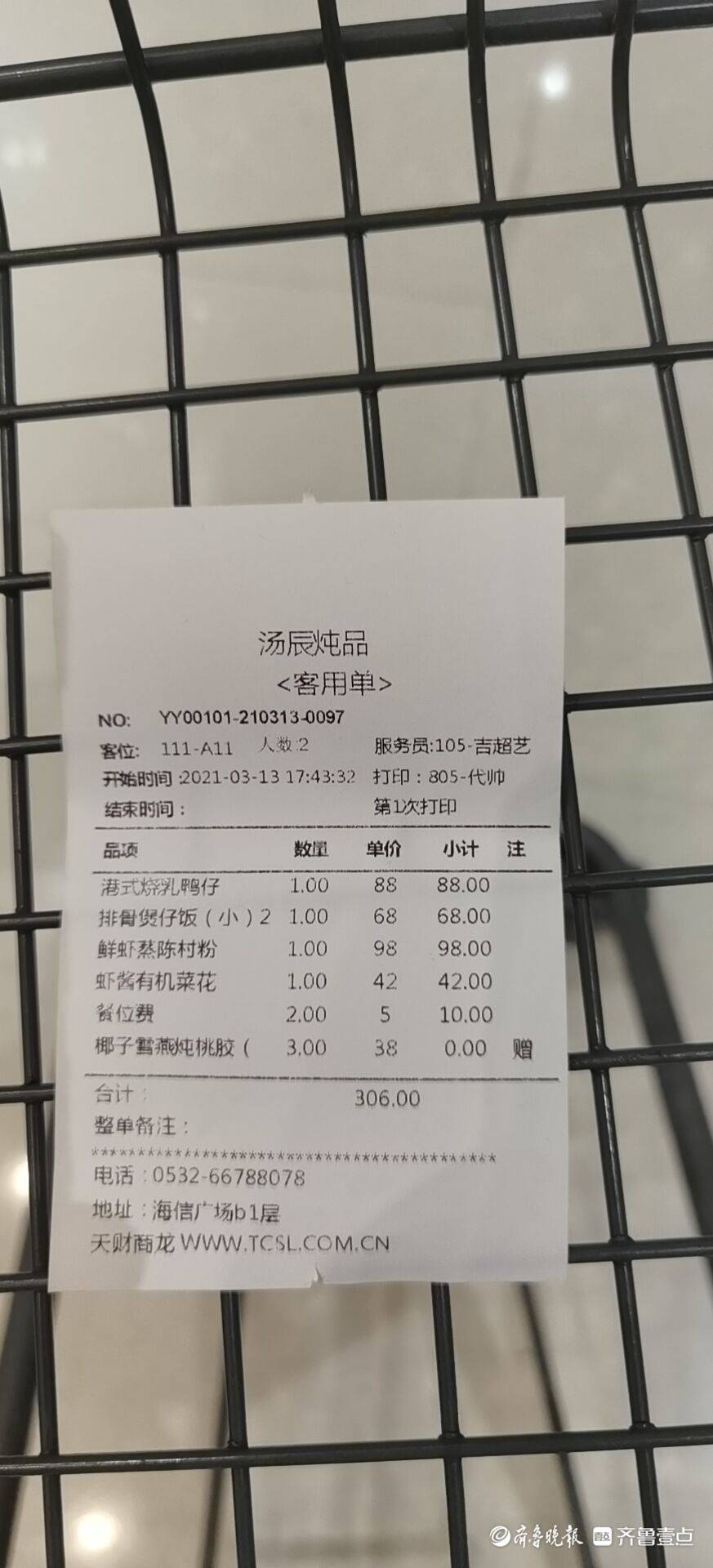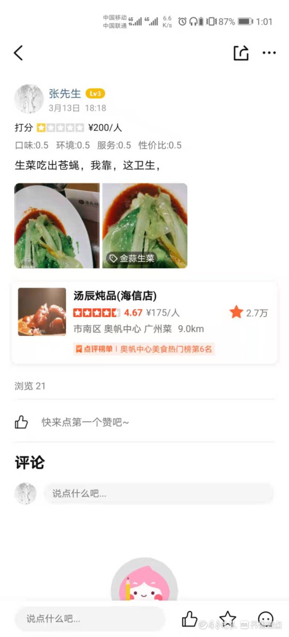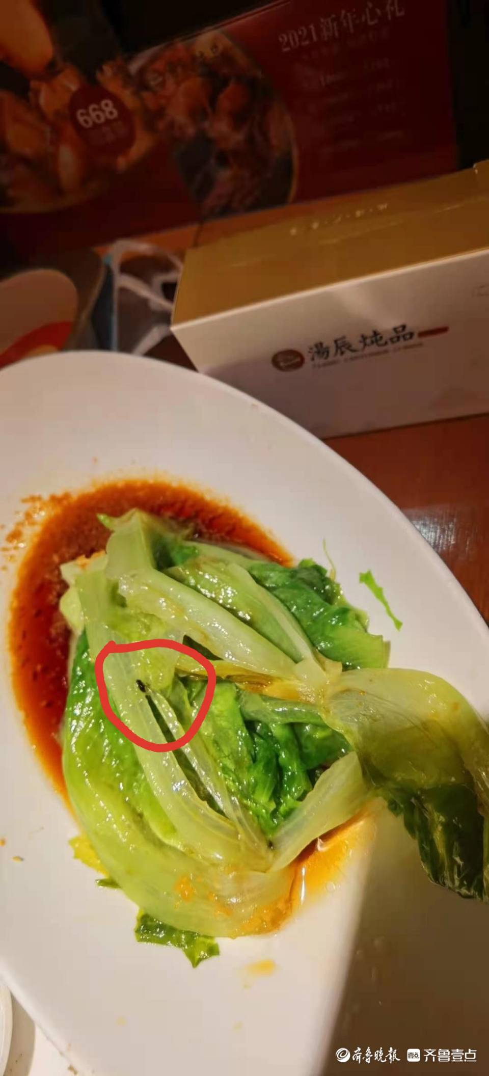 陪女友在汤辰炖品(海信广场店)用餐竟吃出一只苍蝇!日前,消费者张先生向齐鲁晚报·齐鲁壹点反映称,有苍蝇的菜名为金蒜生菜,女友发现后顿时恶心得想吐。对此,店家方面表示,生菜系南方采购,后厨人员在清洗过程中存在工作失误,愿意免单赔偿。