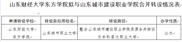 根据《中华人民共和国高等教育法》《普通本科学校设置暂行规定》等有关法律法规和教育部关于独立学院转设的有关文件精神,山东财经大学东方学院拟与山东城市建设职业学院合并转设为本科层次职业大学,现向社会公示。
