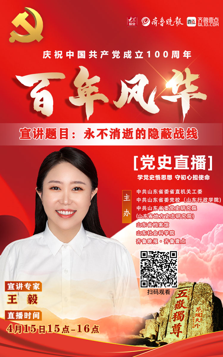 直播海报4王毅:永不消逝的隐蔽战线 云端党课 2021-04-13 2216 学党史悟思想,守初心担使命。中共山东省委省直机关工委、中共山东省委党校、中共山东省委党史研究院(山东省地方史志研究院)、山东省档案馆、山东社会科学院与齐鲁晚报·齐鲁壹点联合主办《“百年风华”党史直播》。4月15日下午15:00宣讲嘉宾:王毅老师。 责任编辑:修伟华