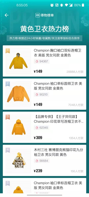 为此得物App还对平台内的黄色卫衣进行了热力排名,得出了“黄色卫衣热力榜”,用户不仅在社区分享、关注穿搭,还可以在“种草”后,更方便地挑选自己中意的单品。穿上亮丽黄的卫衣,成为这条街上最靓的仔。