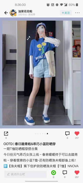 得物App穿搭达人“油菜花花啦”发布OOTD(意为“每日穿搭”)表示,穿着惬意的小蓝T恤,春意暖暖终于可以去踏青,最喜欢藏蓝色T恤上的太阳花,印花图案非常可爱。