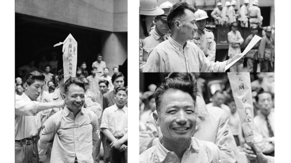 照片里的人物叫朱大同,他1949年5月11日被国民党以汉奸罪枪杀于上海闸北宋公园,同他一起被枪杀的还有其他几名烈士。照片里他的形象是被一名当时的美国记者无意间记录下来的。这些年来,民间对朱大同的烈士身份有所争议,是因为在当时“官方的”“公开的”材料里,有他加入中统、叛降日军、担任国民党县长和军队要职等等的记录,但“铁证如山”的是:在朱大同死后的第二年也就是1950年,上海便将他追认为了烈士,当时追认的具体原因没有正式公布。1981,朱大同又再次被追认为了烈士。我党两次将朱追认为烈士,都没能打消部分群众对朱身份的疑虑。如果没有照片里的背景,只看朱大同的笑容,我们会想象这应该是一个多么幸福的时刻才可以让人这样开怀大笑。但其实当时这个笑容的背后,对朱来说是生命即将终结的时刻,而且由于群众的不明就里,当时还有好多人对朱扔烂菜叶、臭鸡蛋等等。可是朱大同呢?没有辩解,没有怨恨,只露出了豁达的笑,真正的视死如归,所以这个笑容尤其地具有冲击力。
