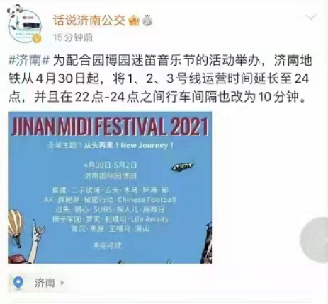 为了配合园博园迷笛音乐节的活动举办,济南公交在官微发布消息,济南地铁将从4月30日起,将1、2、3号线运营时间延长至24点,并且在22点-24点之间行车间隔调整为10分钟。这对于参加音乐节的乐迷朋友来说无疑是极大的利好消息,也疏解了园博园附近酒店住宿的压力。