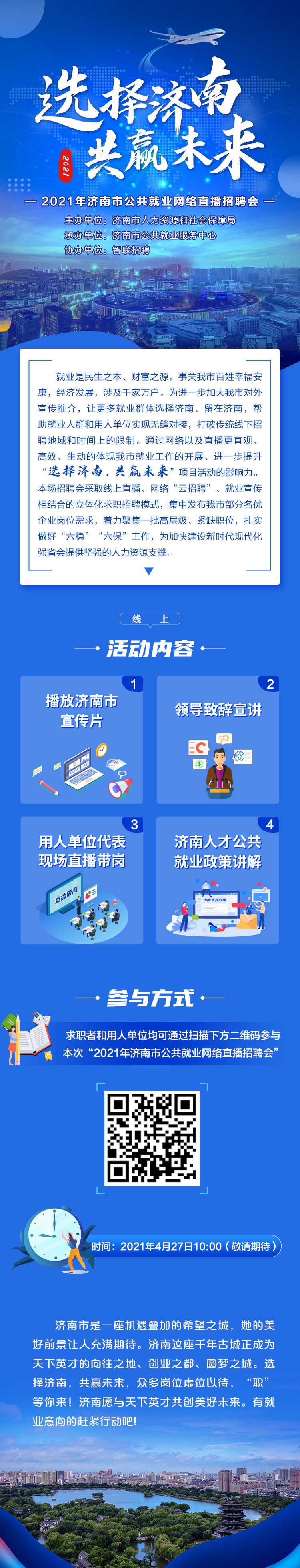 4月27日(星期二)上午,“选择济南共赢未来”2021年济南市直播带岗云招聘会将举办。