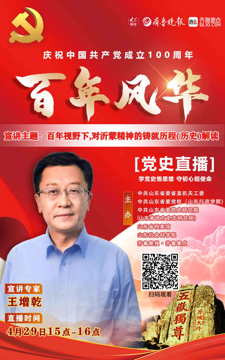 直播海报5王增乾:百年视野下,对沂蒙精神的铸就历程解读 云端党课 2021-04-30 1.3万 学党史悟思想,守初心担使命。中共山东省委省直机关工委、中共山东省委党校、中共山东省委党史研究院(山东省地方史志研究院)、山东省档案馆、山东社会科学院与齐鲁晚报·齐鲁壹点联合主办《“百年风华”党史直播》。4月29日下午15:00宣讲主题:王增乾:百年视野下,对沂蒙精神的铸就历程(历史)解读 责任编辑:修伟华