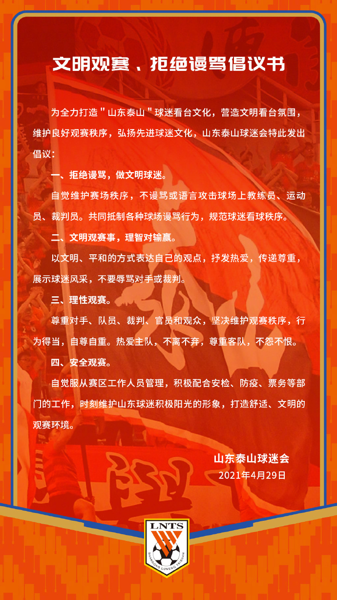 4月29日消息,今日山东泰山球迷会通过社交媒体发布《文明观赛、拒绝谩骂倡议书》。