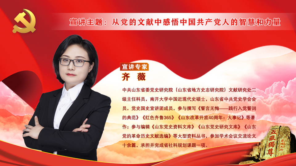 主持人:历史照亮未来,征程未有穷期。人类总是不断从历史中汲取智慧和力量。在漫漫历史长河中,中国共产党历史无疑是那颗最闪耀的星,鉴往知来,指引着我们前进的方向。回望中国共产党走过的百年历程,是以生命信仰和不懈奋斗所铸就的不朽史诗。而党的文献作为这份闪耀历史的承载,成为我们触碰、感悟这段历史最直接的载体,伴随着中国共产党走过了极不平凡的一百年。今天,我们邀请齐老师,为我们带来宣讲主题《从党的文献中感悟中国共产党人的智慧和力量》。