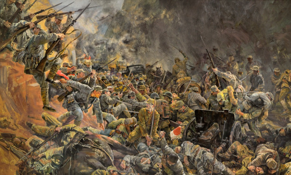 一是学习见微知著的洞察力。为政者,要有发展眼光、全局意识,然而也要有见微知著的洞察力。细节体现了水平,细节也决定了成败。1937年9月29日,延安《新中华报》刊载了一篇简短的新闻:《八路军开始第一个大胜利》,短短几百字却让人振奋。新闻报道中的这个胜利指的是平型关大捷。这场战斗的胜利来之不易,有两个细节值得我们注意:一是“拽着马尾巴闯激流”。9月24日午夜时分,部队向伏击地域奔袭,天降大雨导致山洪暴发,水深齐腰。军情火急,战士们把枪弹挂在脖子上手拉手闯激流,有的拽着马尾巴趟过去,按时到达伏击地域。一夜的大雨冲刷掉了行军的痕迹,使日军丝毫没有察觉;二是“布鞋是山地争夺战法宝”。在抢占老爷庙制高点时,由于暴雨刚过,日军笨重的皮鞋、皮靴阻碍了其机动性。686团3营战士们的布鞋,这时候却成了登山的制胜法宝。虽然日军抢先爬山,但八路军战士却先一步到达山顶,一顿猛烈的手榴弹让敌人滚落下山。指挥员林彪在《平型关战斗的经验》和《抗日战争的经验》两篇文献中都提到了这两个细节,并且认为“这些都是我们争取抗战胜利的必要条件”。现在给大家展示的,正是一幅平型关大捷的油画,它形象地描绘了当时八路军战士们英勇杀敌的场面。